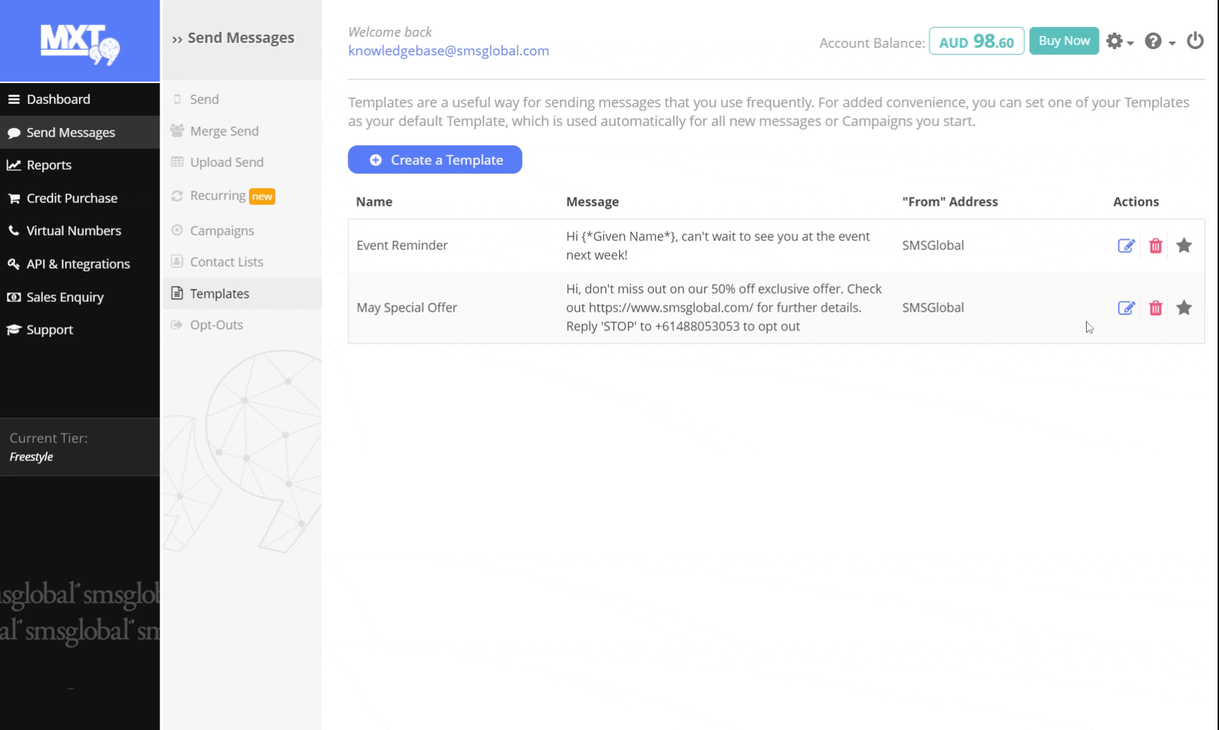 Editing an SMS Template How to edit your existing saved SMS templates in MXT 1. Select ‘Send Messages’ on the left-hand side of the MXT menu, and click 'Templates’. 2. Find the template that you would like to edit, and click the corresponding 'pencil icon' to edit. 3. Make the necessary changes to your template. 4. Click ‘Save Template’ to confirm changes.