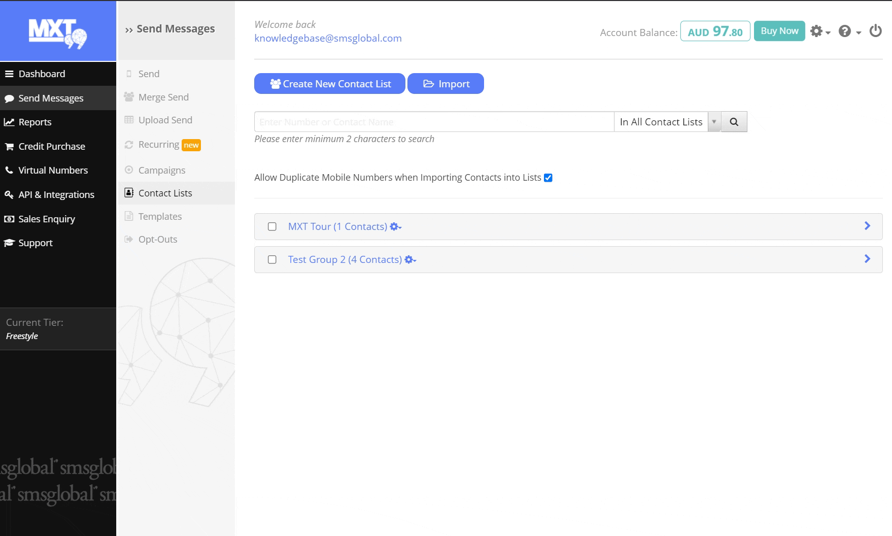 1. Select ‘Send Messages’ from the left-hand side of the MXT menu, then click on ‘Contact Lists’.