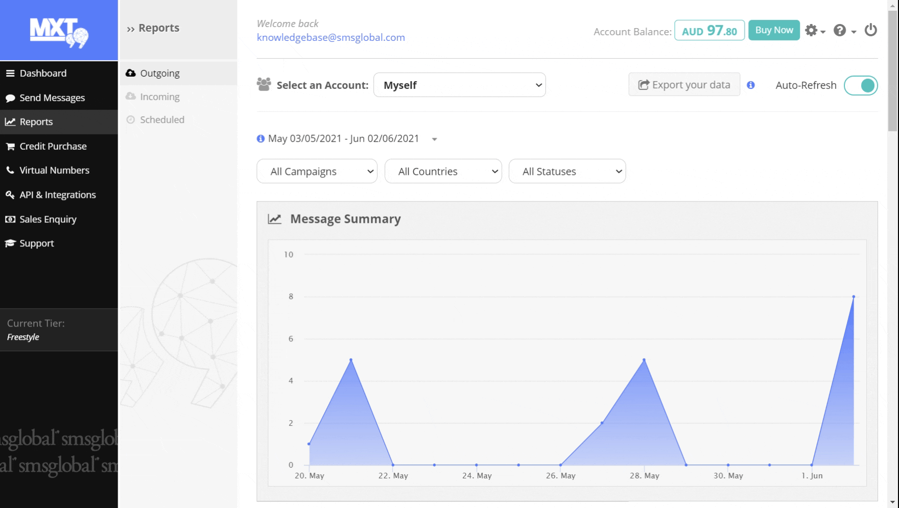 1. Click ‘Reports’ on the left-hand side of the MXT menu, then choose the type of report that you would like to export: 'Outgoing', 'Incoming', or 'Scheduled' messages. For this example, we will choose 'Outgoing'.