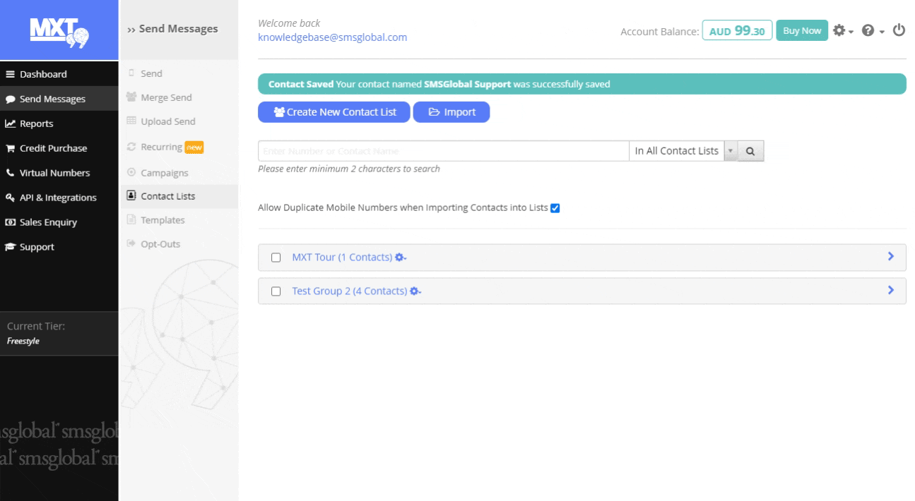 1. Contact Lists page