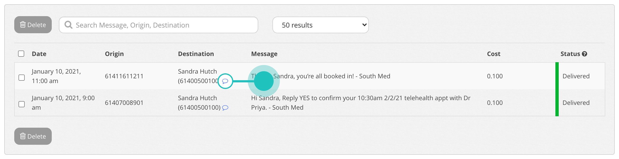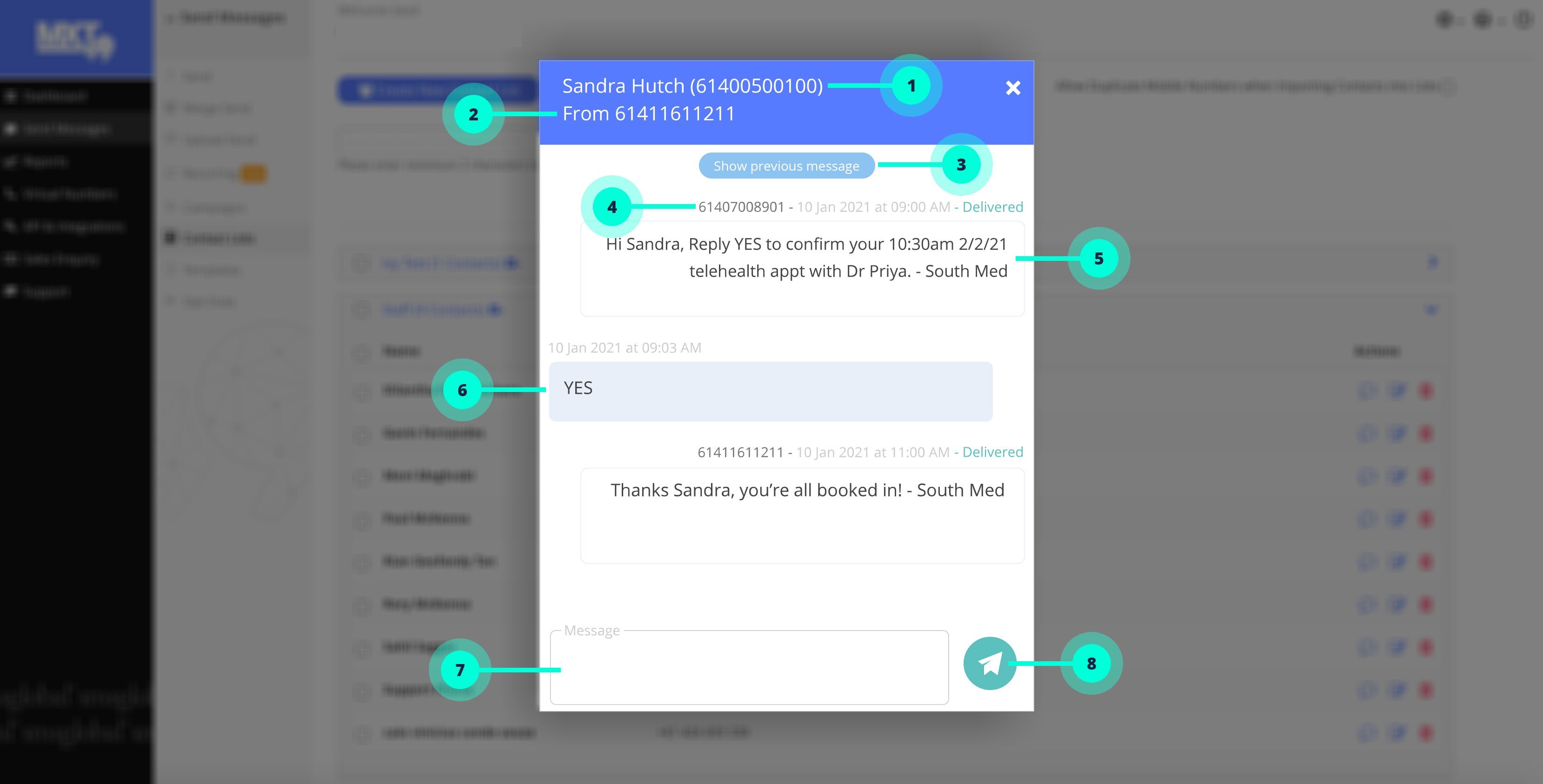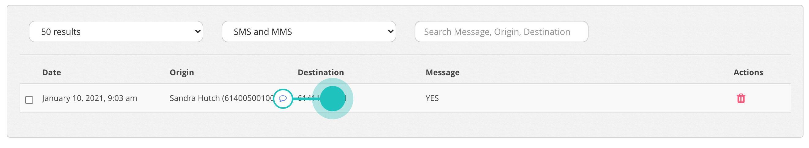 The Conversation Window can be accessed from various sections within MXT just by clicking on the speech bubble for a specific number.