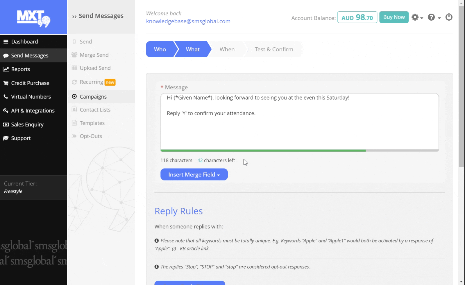 Creating Reply Rules allows you to send an automatic response to your recipient if they reply with a specified keyword. This can be sent immediately or after a delay, and you can specify custom rules for managing customer opt-outs.