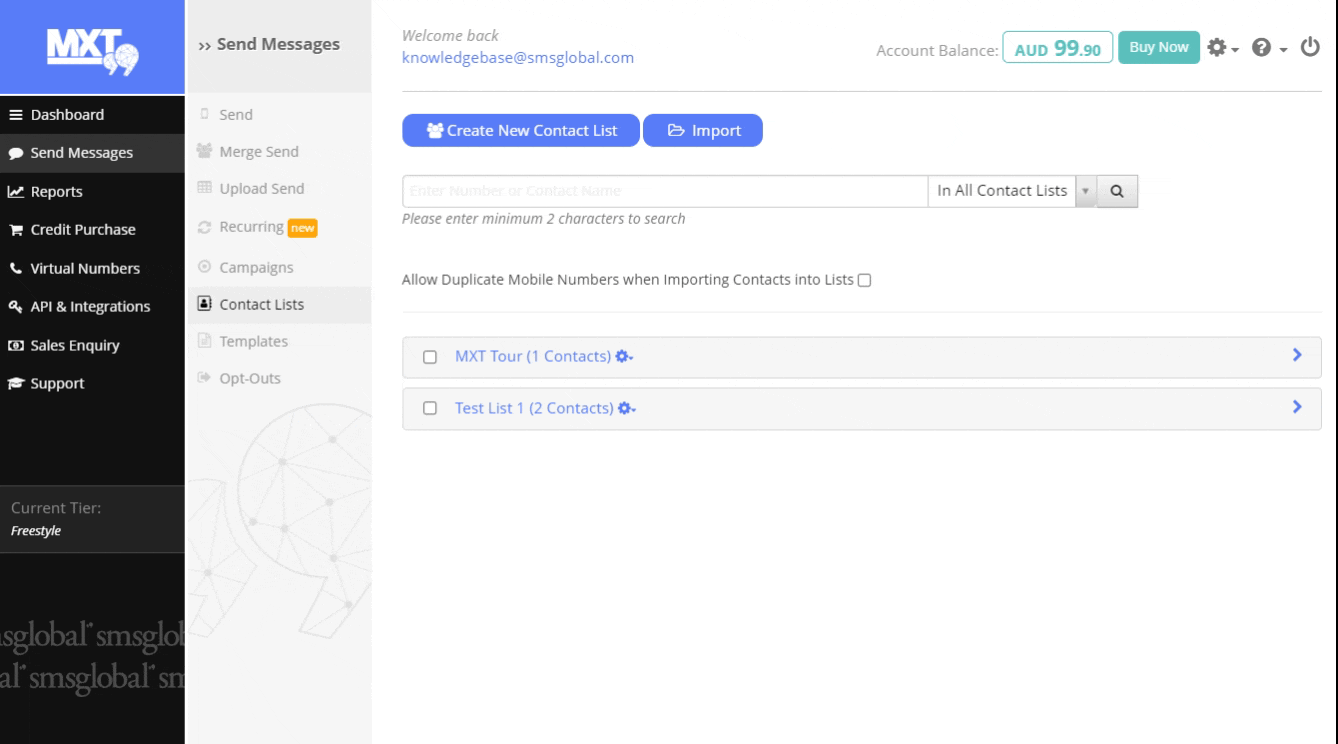 1. Select ‘Send Messages’ on the left-hand side of the MXT menu, then click on ‘Contact Lists’.