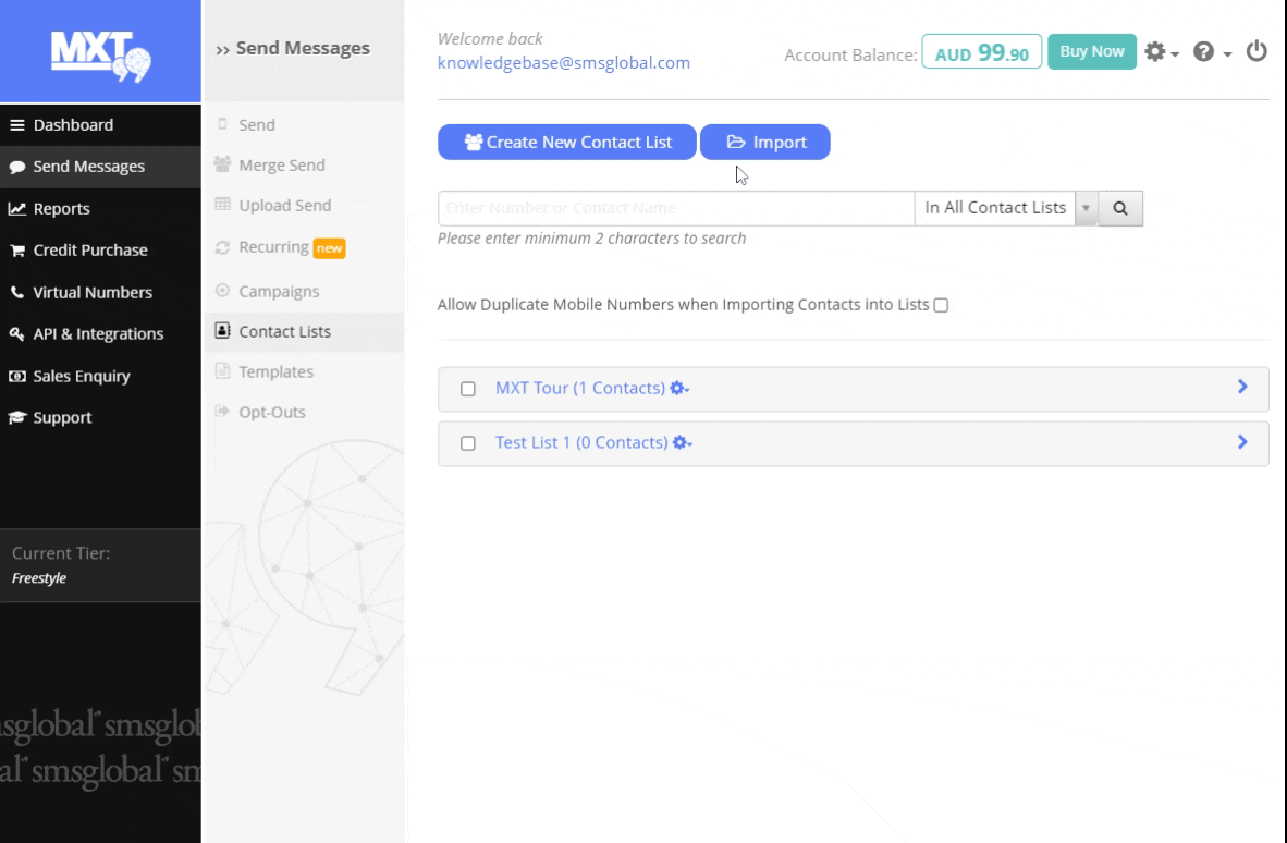 Tip: Make sure this file is formatted correctly and contains the relevant country prefixes. For information on how to do this, see: How to format a contact list for MXT in excel.