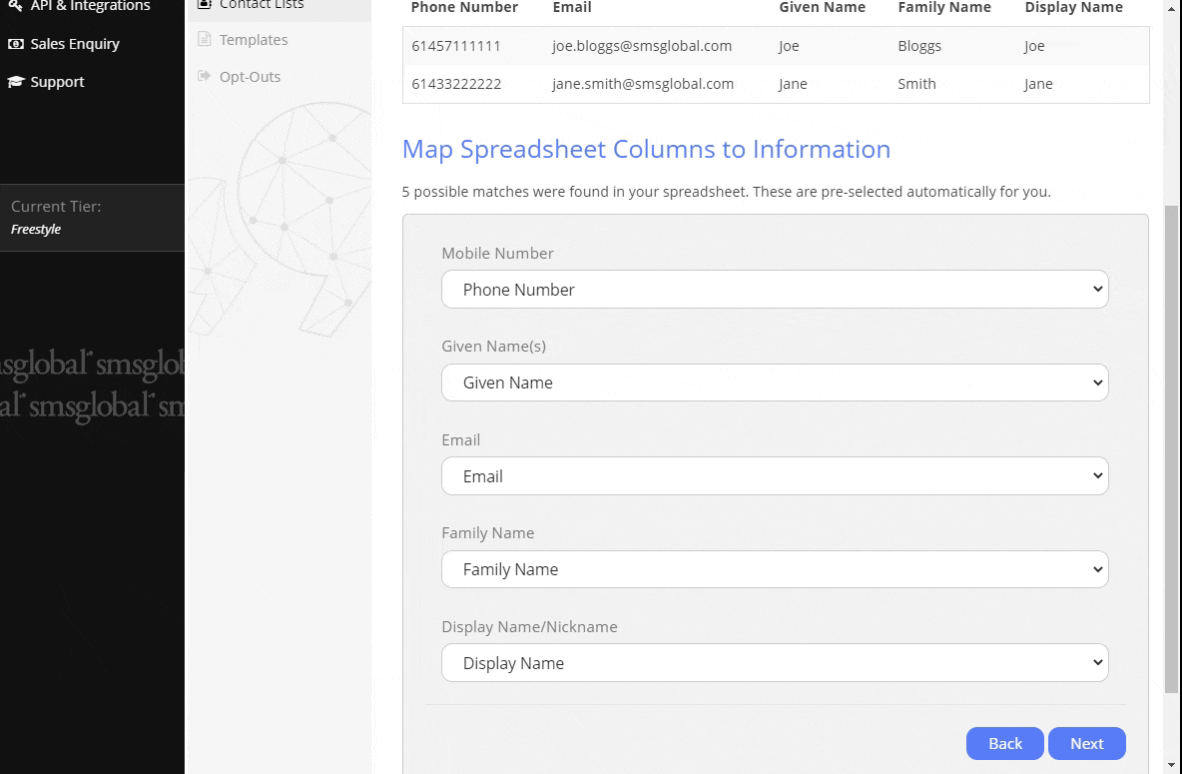 Note: You can choose to leave any number of these fields blank, as long as at least the mobile number column is specified.