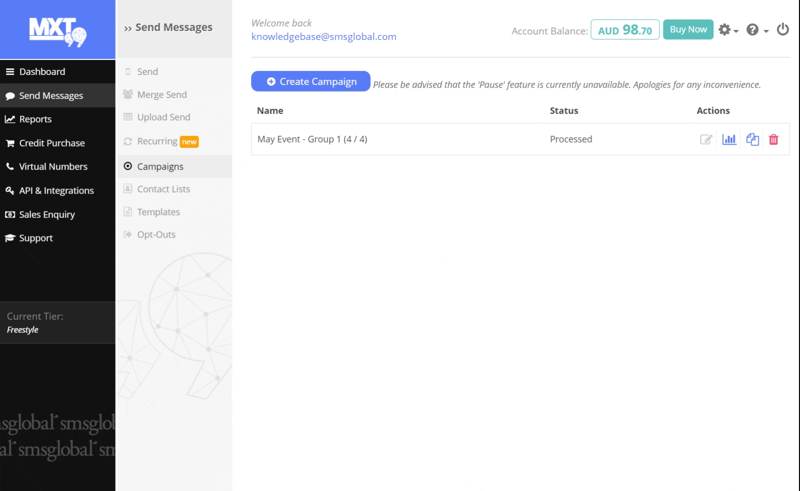 1. Select ‘Send Messages’ from the left-hand menu of MXT, then select ‘Campaigns’ to see a list of all your campaigns.