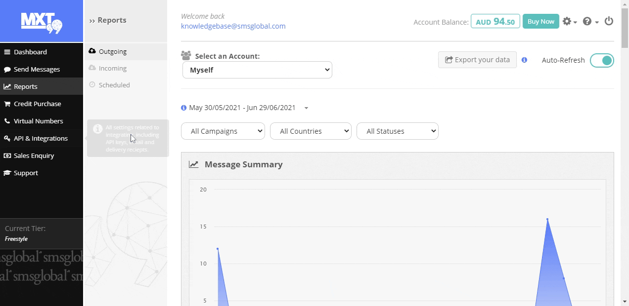 1. Select ‘Reports’ on the left-hand side of the MXT menu, then click on 'Outgoing' to view the delivery receipts available for all messages you have sent.