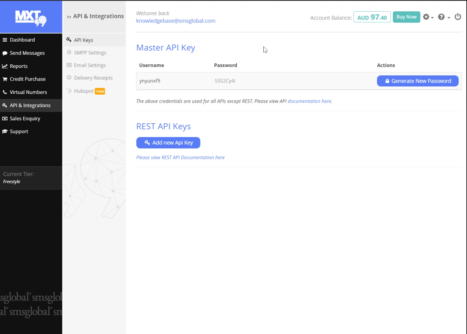 Your Master API Key is used for accessing SMSGlobal via our HTTP API, SOAP API, as well as SMPP.