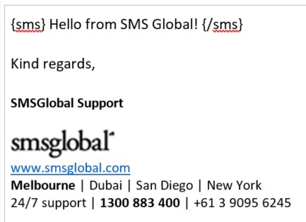 For example, if you type {sms} Hello from SMS Global{/sms}, then the only content that will be sent in the SMS will be the content in between the tags.