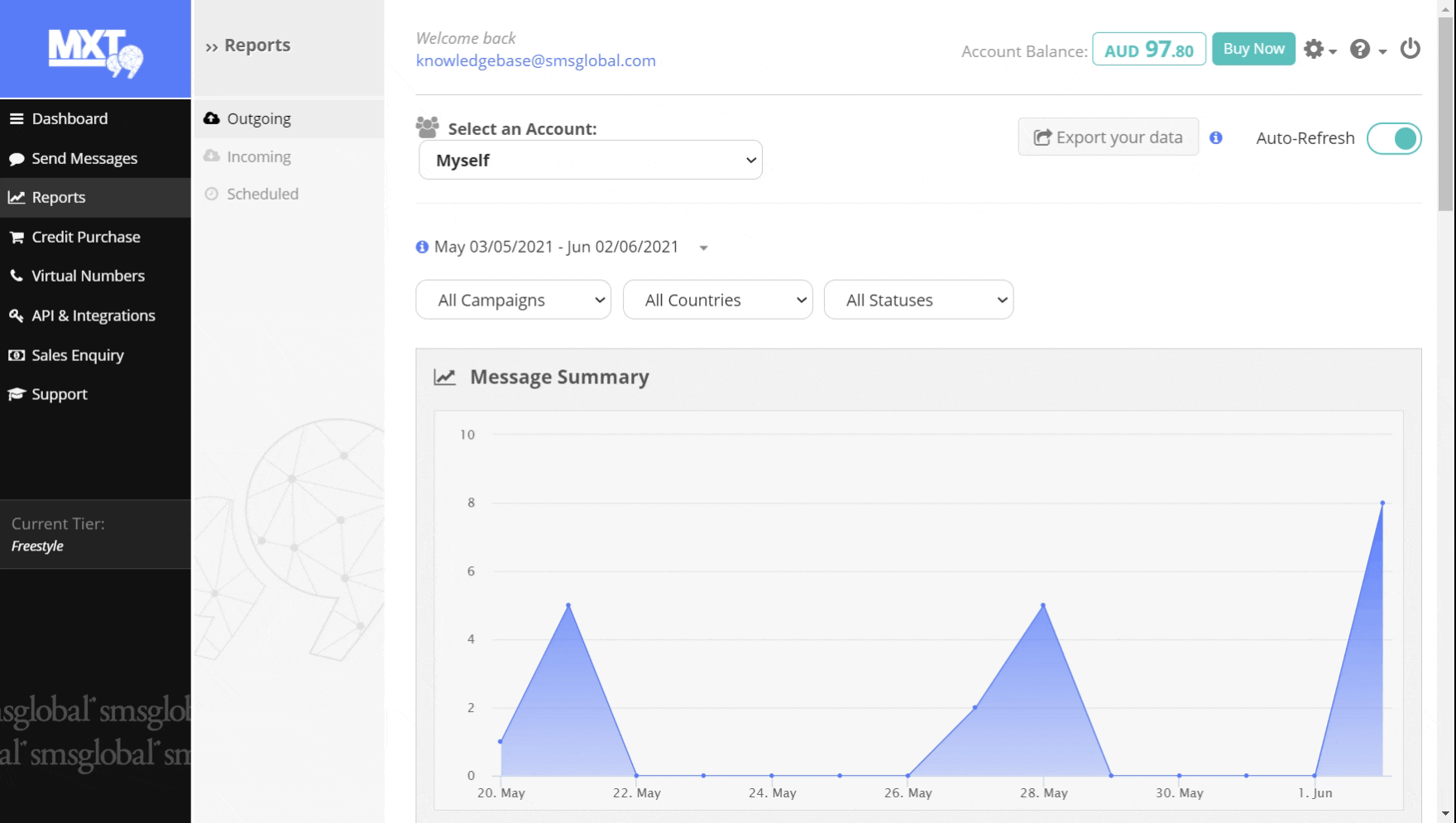 2. You have the option to filter reporting by message status, destination country, or campaign.