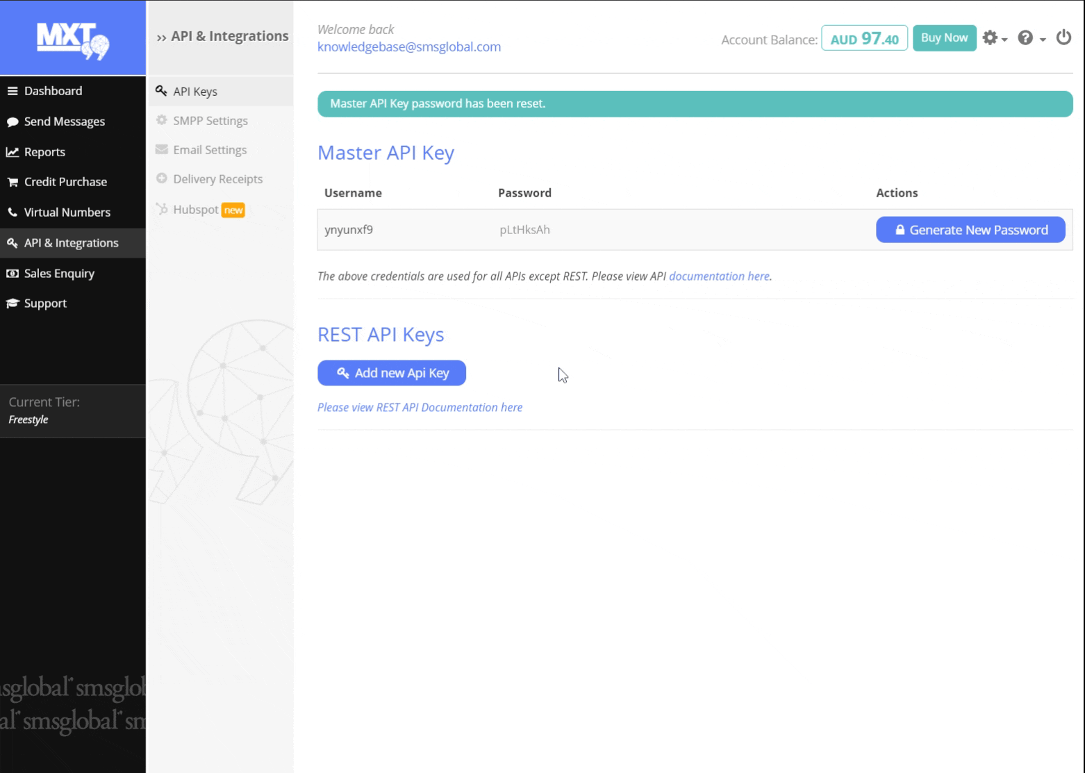 For HTTP, SOAP APIs, as well as SMPP API, please see Master API Keys.