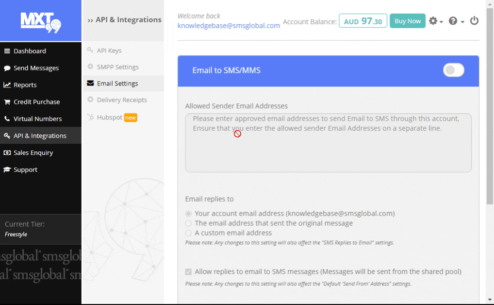 Note: If you don't want to receive replies from Email to SMS via SMSGlobal Shared Numbers, make sure the box next to 'Allow replies to email to SMS messages' is not ticked. If you would like to allow replies, ensure that this box is ticked.