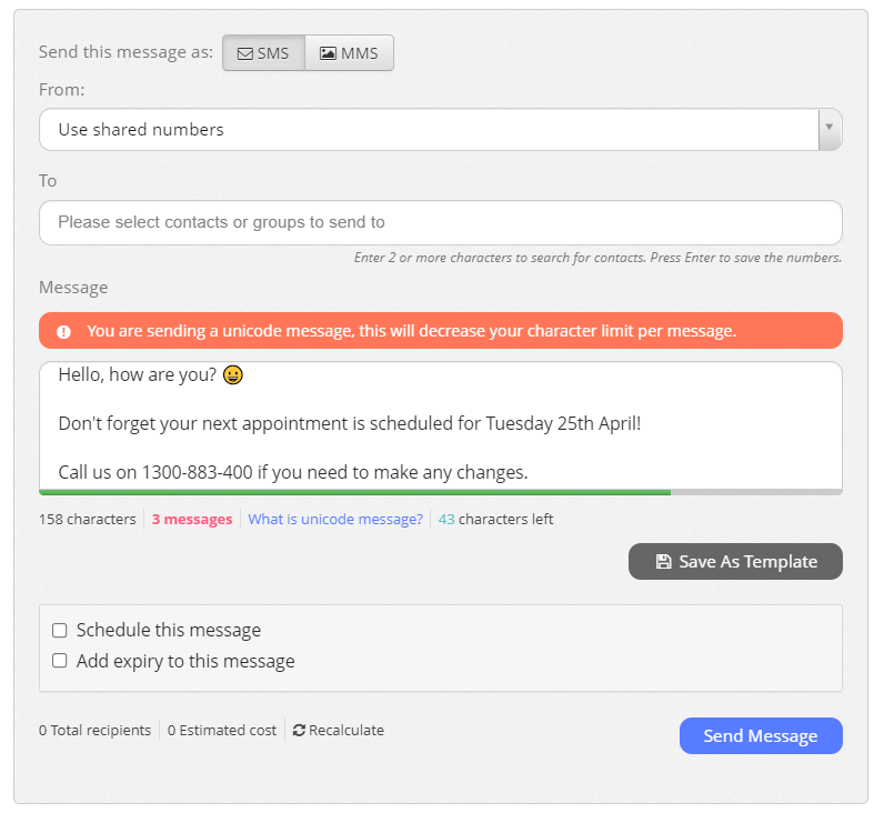 If your message is split into multiple parts, you have either exceeded the standard 160 character limit or there's a Unicode character present in your message. Unicode characters use more data to send than regular characters. Therefore only 70 characters can be included in a single SMS, as opposed to the standard 160 character limit.
